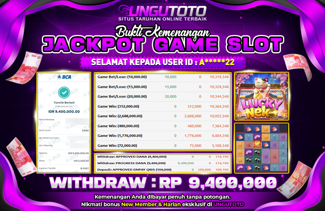 Selamat Kepada Member UNGUTOTO A⭑⭑***⭑22 Telah Jackpot Di LUCKY NEKO