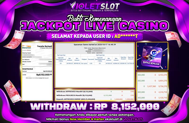 Selamat Kepada Member UNGUTOTO AD⭑⭑***⭑⭑T Telah Jackpot Di LIVE CASINO - PRAGMATIC PLAY SPACEMAN
