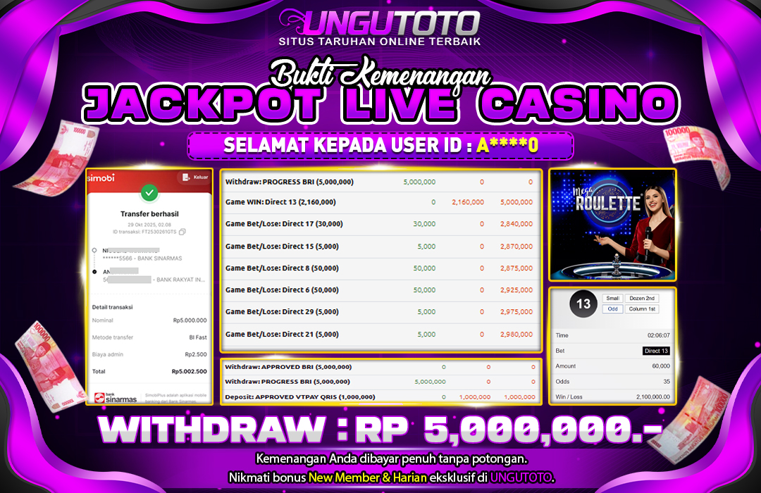Bergabunglah dengan UNGUTOTO hanya dengan deposit minimal 5.000 rupiah. Kami menyediakan berbagai metode pembayaran seperti transfer bank, e-wallet, dan QRIS, sehingga Anda bisa melakukan transaksi dengan mudah. Proses penarikan juga sangat cepat, dengan minimal withdraw hanya 50.000 rupiah, tanpa biaya tambahan.