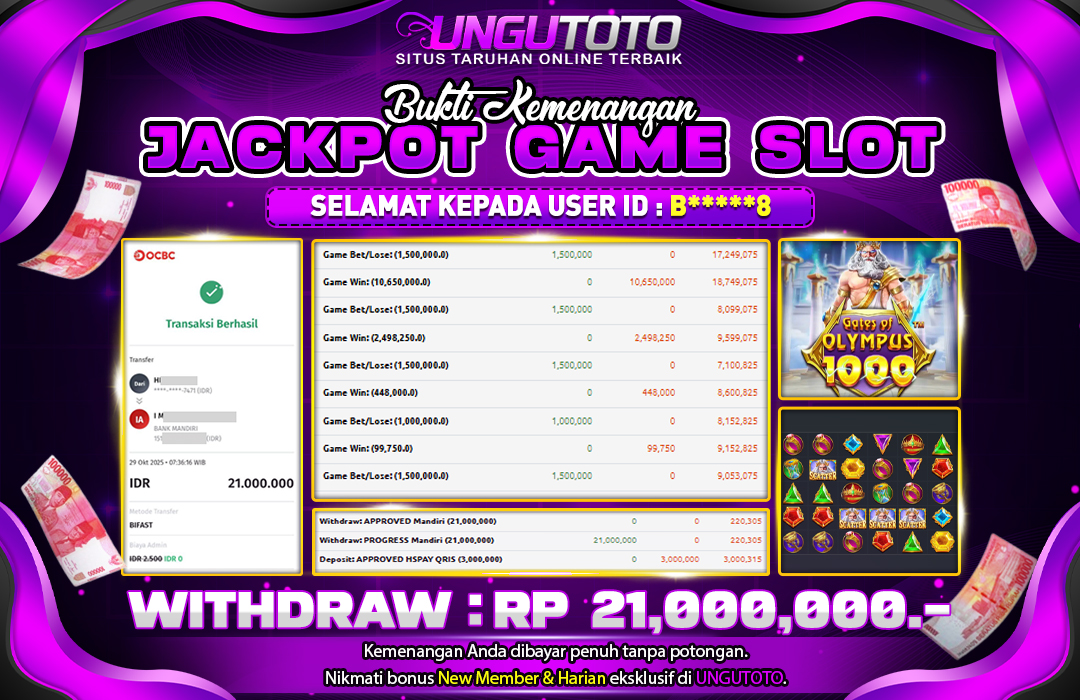 Selamat Kepada Member UNGUTOTO J****8 Telah Jackpot Di GATES OF OLYMPUS 1000