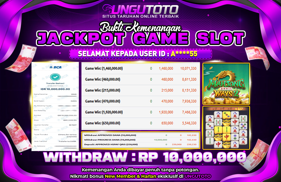 Bergabunglah dengan UNGUTOTO hanya dengan deposit minimal 5.000 rupiah. Kami menyediakan berbagai metode pembayaran seperti transfer bank, e-wallet, dan QRIS, sehingga Anda bisa melakukan transaksi dengan mudah. Proses penarikan juga sangat cepat, dengan minimal withdraw hanya 50.000 rupiah, tanpa biaya tambahan.
