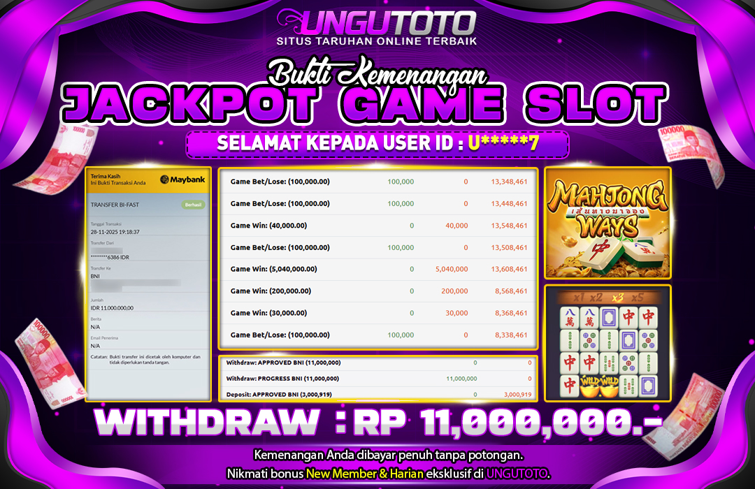 Selamat Kepada Member UNGUTOTO U****7 Telah Jackpot Di MAHJONG WAYS