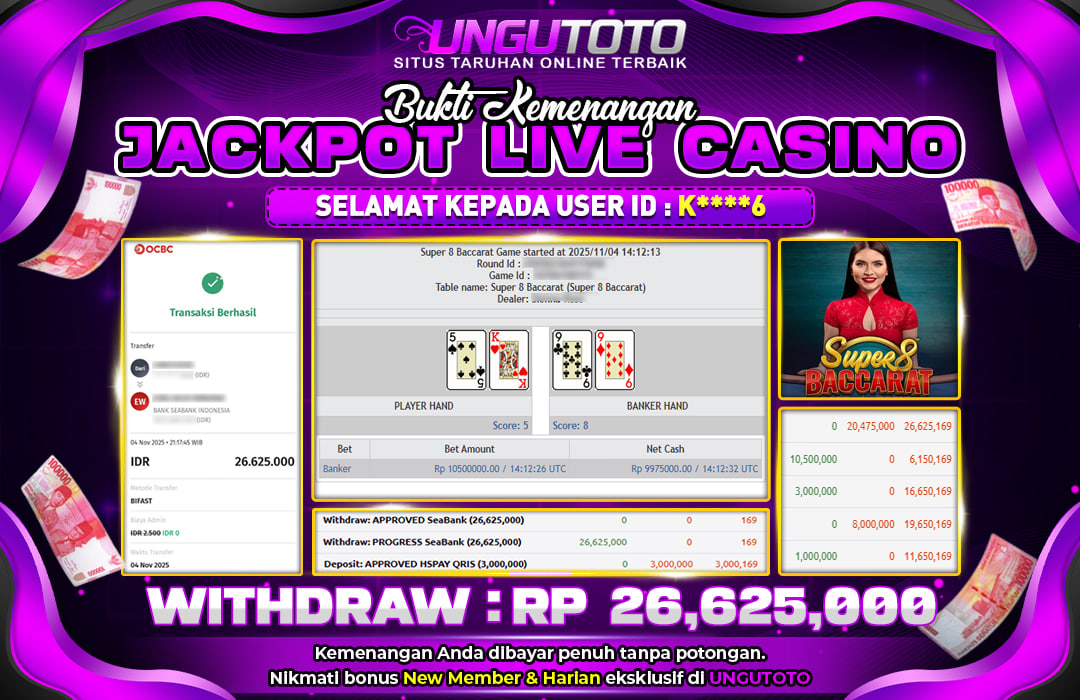 Selamat Kepada Member UNGUTOTO K⭑⭑***⭑⭑6 Telah Jackpot Di SUPER8 BACCARAT