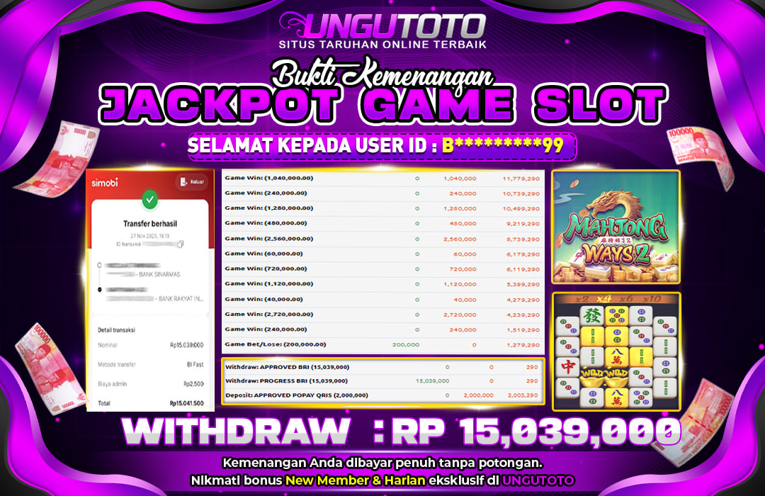 Selamat Kepada Member UNGUTOTO B⭑⭑⭑⭑***⭑⭑⭑99 Telah Jackpot Di MAHJONG WAYS2