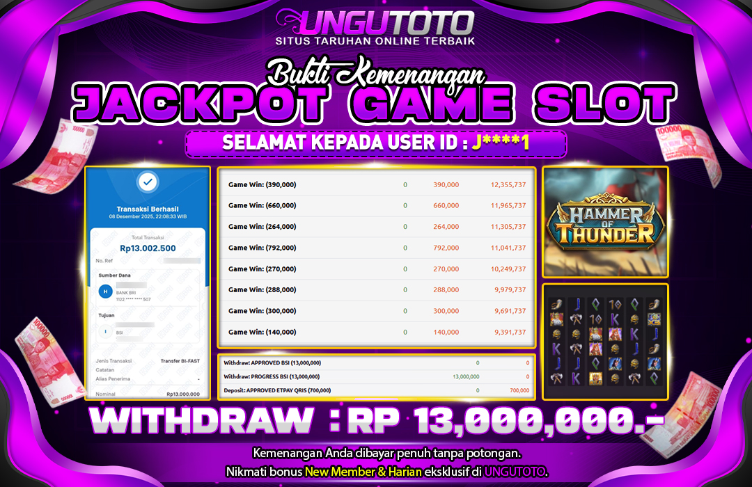 Selamat Kepada Member UNGUTOTO J****1 Telah Jackpot Di HAMMER OF THUNDER