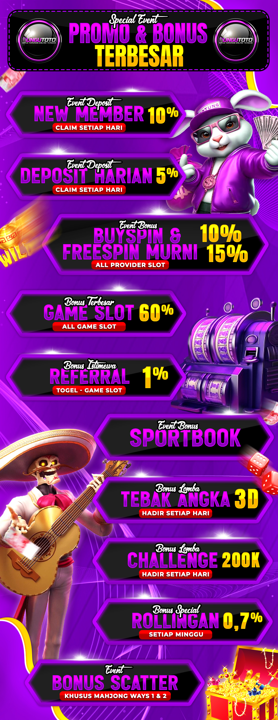Bergabunglah dengan UNGUTOTO hanya dengan deposit minimal 5.000 rupiah. Kami menyediakan berbagai metode pembayaran seperti transfer bank, e-wallet, dan QRIS, sehingga Anda bisa melakukan transaksi dengan mudah. Proses penarikan juga sangat cepat, dengan minimal withdraw hanya 50.000 rupiah, tanpa biaya tambahan.